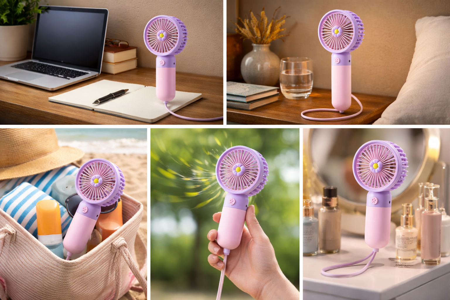 Ergonomik tasarımı ile elde rahat tutulur ve stand aparatı sayesinde masaüstü vantilatör olarak da kullanılabilir. Hafif ve kompakt yapısı sayesinde çantada kolayca taşınabilir.